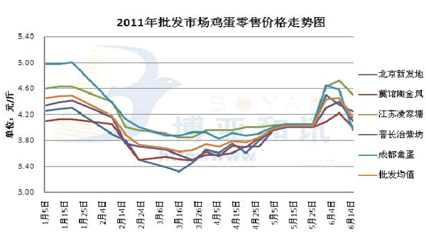 2011年(24周)主产区鸡蛋价格走势 本周,主产区蛋价震荡调整,小幅下滑。主产区均价3.99元/斤,较上周降0.17元/斤。 ![]() 图1.2011年(24周)主产区鸡蛋棚前批发价格走势 图2.2011年(24周)部分批发市场鸡蛋市场零售价格走势 2011年(24周)主产区淘汰鸡价格走势