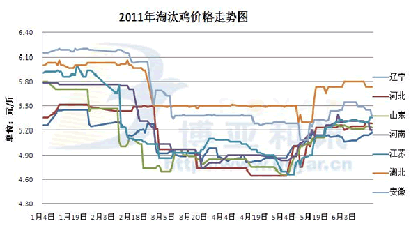 本周,淘汰鸡价格稳中有降,主产区均价5.35元/斤,较上周降0.01元/斤。 ![]() 图1.2011年(24周)主产区淘汰鸡价格走势 |