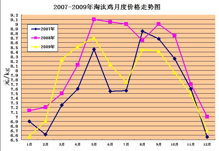 2、淘汰鸡价格:全年两次淘汰鸡价格高峰分别在3-5月(8.2-8.7元/kg)、8-9月(8.45元/kg左右),从全年的比较看,受09年2月鸡蛋价格快速启动回升的影响,从3月上旬到4月下旬价格均高于07、08年,2009年全年的淘汰鸡价格平均7.82元/kg,比08年同比下降4.4%,比07年价格同比上涨2%。(见图2)