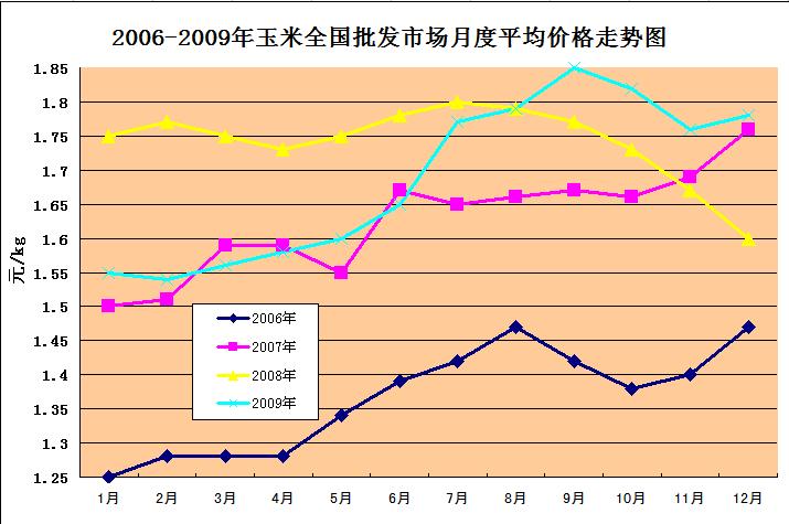 1、玉米:(见图3)09年全年玉米平均价格1.69元/kg,08年全年玉米平均价格1.74元,比08年同比降了2.9%,比07年涨4%,09年上半年玉米价格比07年降了近10%,玉米价格从7月开始上升,9月-10月大幅度的上涨,导致玉米下半年价格比08年涨了3.8%。影响因素分析: