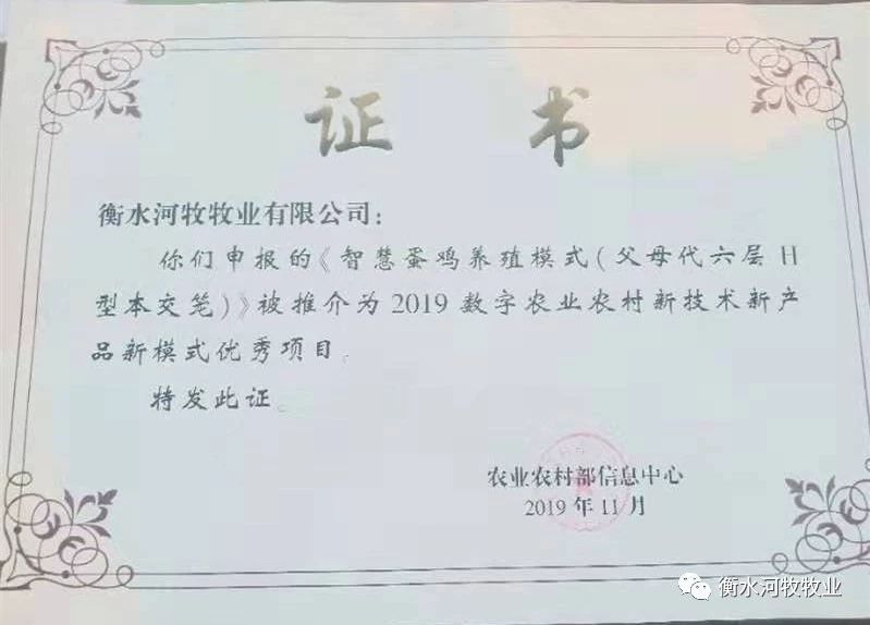 衡水河牧牧业有限公司自2006年成立以来,获得了众多荣誉,2019年11月22日申报的《智慧蛋鸡养殖模式(父母代H型本交笼)》被推为2019年数字农业农村新技术新产品新模式优秀项目。