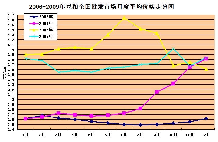 1、玉米:(见图3)09年全年玉米平均价格1.69元/kg,08年全年玉米平均价格1.74元,比08年同比降了2.9%,比07年涨4%,09年上半年玉米价格比07年降了近10%,玉米价格从7月开始上升,9月-10月大幅度的上涨,导致玉米下半年价格比08年涨了3.8%。影响因素分析: