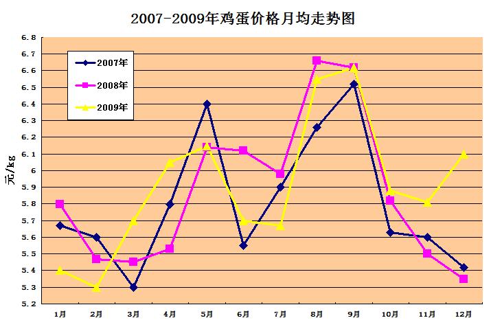2、淘汰鸡价格:全年两次淘汰鸡价格高峰分别在3-5月(8.2-8.7元/kg)、8-9月(8.45元/kg左右),从全年的比较看,受09年2月鸡蛋价格快速启动回升的影响,从3月上旬到4月下旬价格均高于07、08年,2009年全年的淘汰鸡价格平均7.82元/kg,比08年同比下降4.4%,比07年价格同比上涨2%。(见图2)