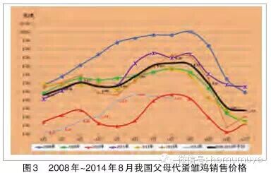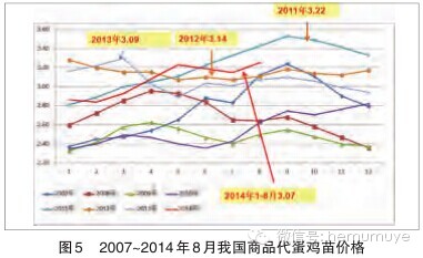 (6)父母代蛋雏鸡平均销售价格。由图3可以看出,2014年1~8月,父母代蛋雏鸡平均销售价格为5.44元/套,比2013年同期的7.32元/套,下降26%。2014年伊始,父母代蛋雏鸡的销售价格就以历史低点开年,虽然持续上涨,但仍维持较低的水平,并一直在成本线下运行。
