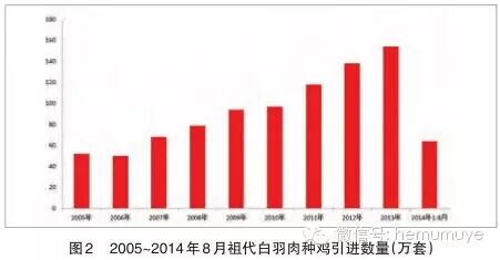 (5)白羽肉种鸡更新量。从图2可以看出,我国从国外引进的白羽肉种鸡从2009年的94万套增加至2013年的154万套,增幅非常大。2014年1~8月,我国已引进白羽肉种鸡64万套,今年计划是121万套,引进速度明显变缓。一季度由于H7N9的卷土重来,市场行情低迷导致引种数量下行,但这也可能成为利好的一面,因为总的引进量减小,意味着产能有进一步下降调整的趋势。