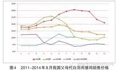 (7)父母代白羽肉雏鸡销售价格。由图4可以看出,2013年,父母代白羽肉雏鸡的销售价格以历史低点开始,4月初受到H7N9的影响,使市场价格一蹶不振,并且持续12个月之久。而2014年肉雏鸡价格以低于成本的历史低价开始,走势非常平稳,第一季度没有上升的迹象,从4月中下旬开始缓慢上升,但增幅不理想,远低于成本。从5月份开始,价格冲上10元,并且持续4个月。