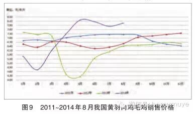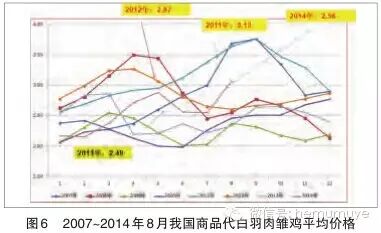 图8 2007年-2014年8月鸡蛋价格 图8可看出,鸡蛋的价格也是逐年提高,预示着刚性成本(如饲料成本)增加。 6 黄羽肉鸡毛鸡销售价格比较
