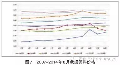 由图5,6可知,鸡苗价格逐年降低。 4 历年饲料价格比较