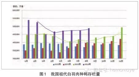 一 家禽生产与市场环境 1 种禽存栏量居高不下 (1)祖代蛋种鸡存栏量。祖代蛋种鸡存栏从2009年的64万套,2010年55万套,2011年45万套,2012年48万套,2013年52~53万套,到2014年1~8月是61万套。2011年蛋种鸡存栏量处于一个相对较低的水平,而当时市场行情较好,企业盈利状况较好。 (2)祖代肉种鸡存栏量。祖代白羽肉种鸡存栏从2010年的99万套,到2011年的102万套,2012年的120万套,2013年的116~118万套,到2014年1~8月是109万套,较去年有所降低。祖代黄羽肉种鸡存栏从2011年的138万套,2012年的131万套,2013年的147~150万套,到2014年1~8月的137万套。可以说,我国肉种鸡存栏一直处于较高的水平。 (3)祖代白羽肉种鸭存栏。数据显示,全世界90%的鸭产自中国,我国白羽肉种鸭存栏量如图1所示。