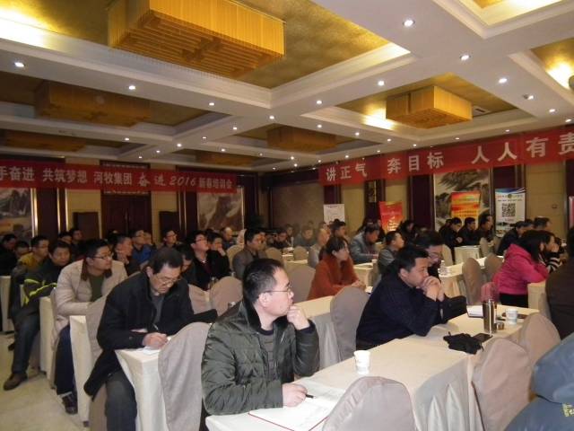 明主题 创效益 个个奋进 讲正气 奔目标 人人有责 ——携手奋进、共铸梦想 2016年2月15-17日河牧牧业在石家庄白鲨阁酒店胜利召开-奋进2016新春培训会,公司管理人员中高层、行政部门、营销部等70余人参加本次培训会。 2月15日下午,公司特邀河北省社会科学院财贸经济研究所研究员先生为展开《2015-2016年经济形势、政策及方向》培训。会上,崔巍研究员就2015年国内经济发展形式进行了总结,并分析、展望了2016年经济发展趋势。同时,我们邀请到了北京市蛋品加工销售行业协会秘书处、新华社特邀经济分析师、畜牧大集网首席经济分析师王忠强先生,对我国蛋鸡产业链保险可行性进行深度解读。